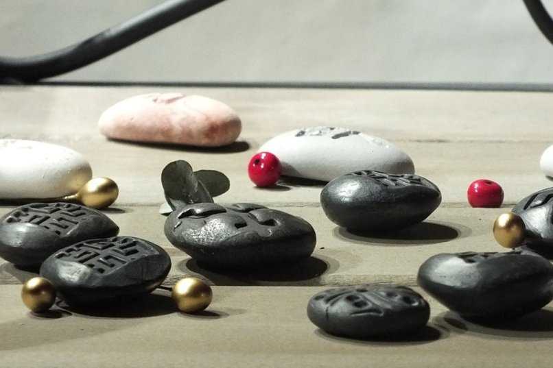 - высохшие камешки раскладываем либо в композиции, накладывая один на другой, либо по одному, либо заполняем ими какую-то емкость (декоративную тарелочку, вазочку, корзину и под.);