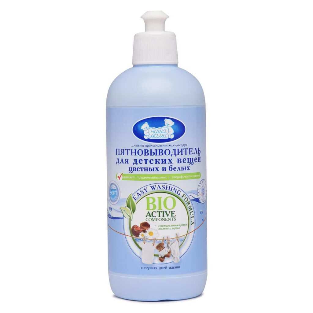 Российский бренд «Наша мама» производит пятновыводитель в виде жидкости во флаконе с дозатором. Его гипоаллергенный щадящий состав позволяет применять средство даже для одежды новорожденных детей.