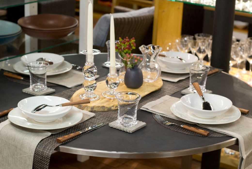 Когда выбран текстиль, необходимо подумать о подборе посуды. Для домашнего праздника необходимы комплекты тарелок, приборов для еды и фужеры. По нормам этикета на стол следует поставить: