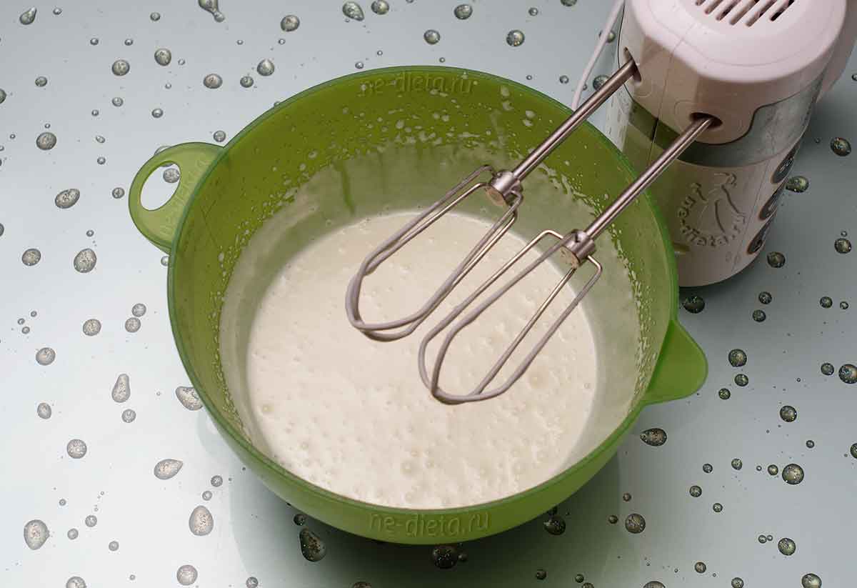Хорошо смешайте тесто до однородного состояния. Должно по густоте получиться обычное тесто для блинов: не очень жидкое, но и не густое.