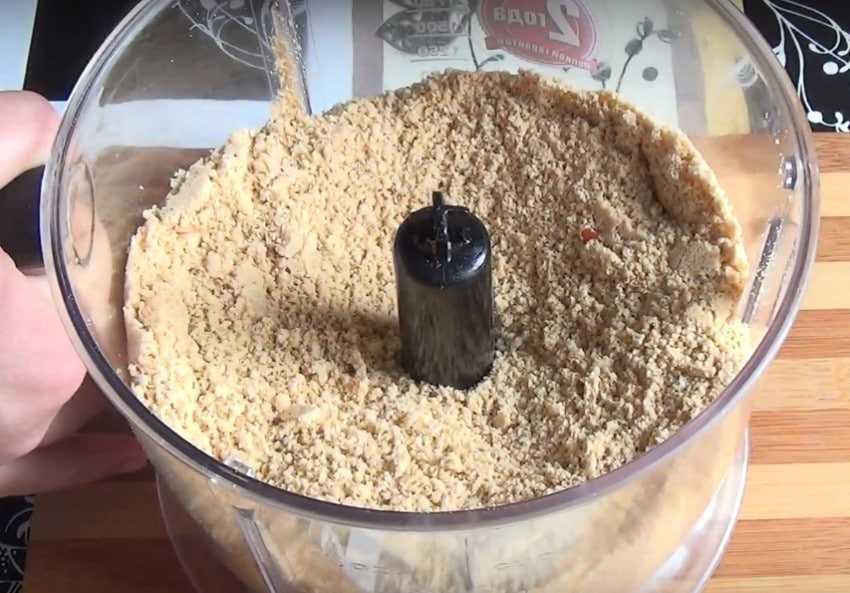 - Орехи и бисквит опускаем в чашу блендера и перемалываем в среднюю крошку однородного помола.