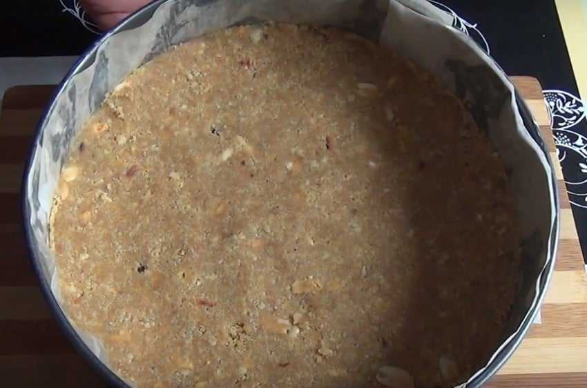 - В форму кладем пергаментную бумагу, смазываем маслом. Можно заменить ее на пищевую пленку. Выкладываем и хорошо утрамбовываем орехово-бисквитную смесь. Оставляем немного посыпки для оформления верхушки торта.