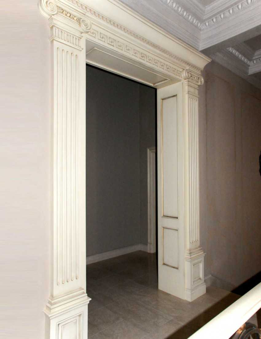 Стандартный комплект межкомнатной арки для прямоугольного проема, как правило, включает в себя две панели сводов, наличники, внутренние пластины арки и свода, соединительные элементы, которые могут быть выполнены, в зависимости от общего стиля арки, в виде строгого карниза либо витой капители.
