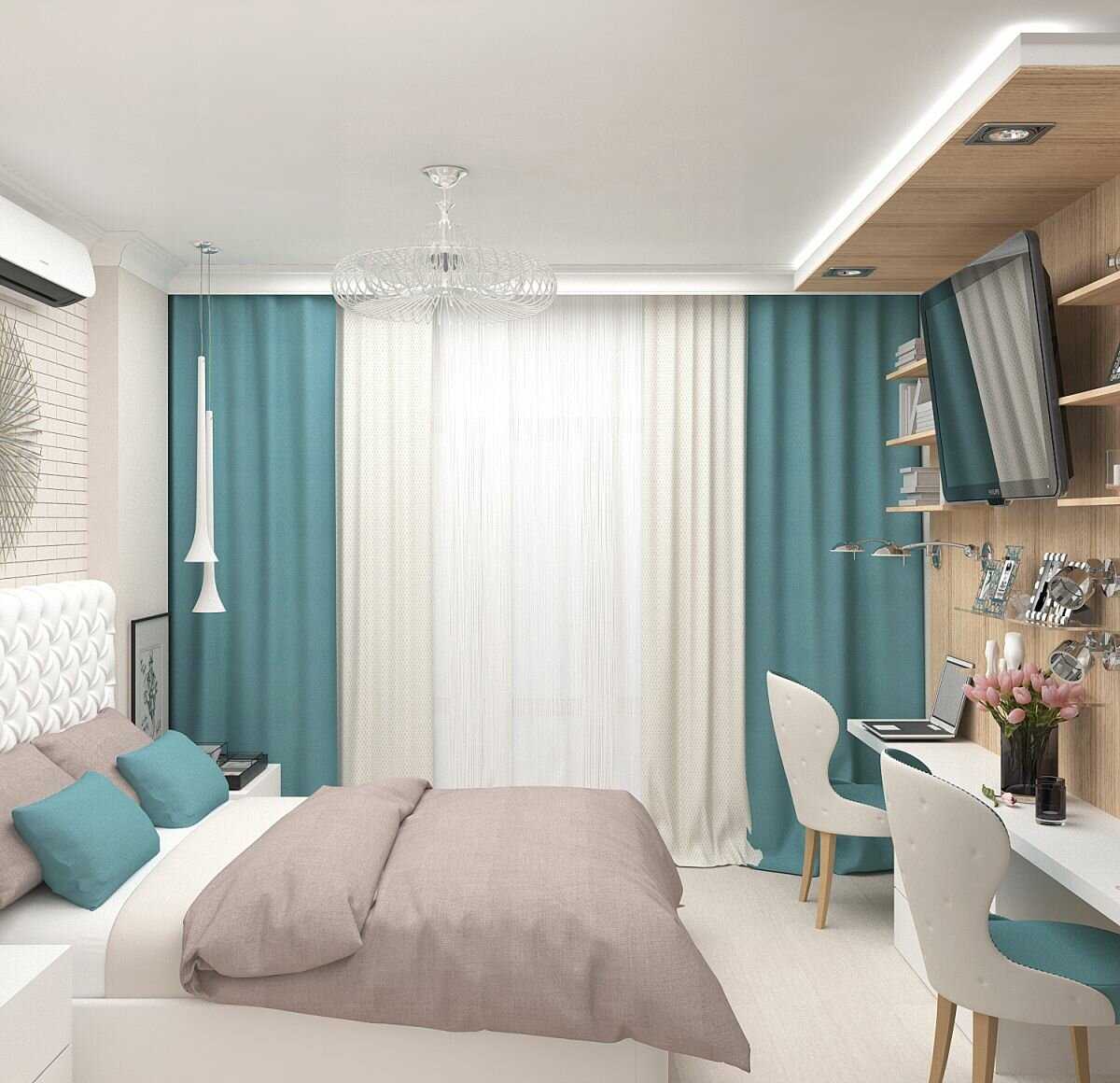 Для этой комнаты лучше выбрать бирюзовые раздвижные гардины.