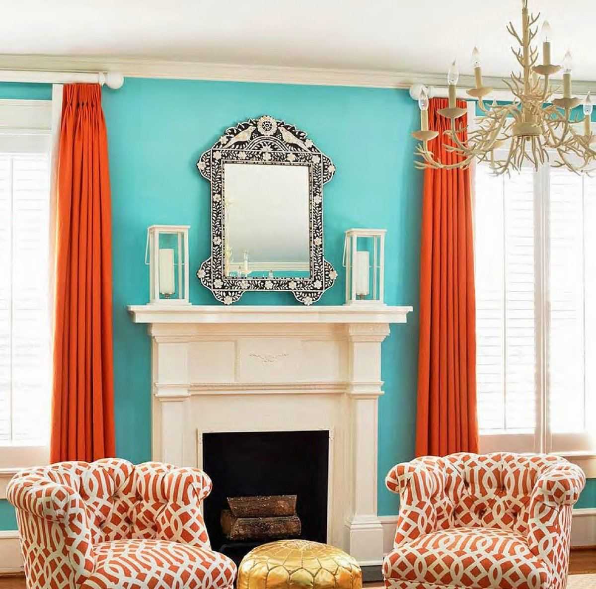 Цвет, который гармонично сочетается с бирюзой, подчеркивая его уникальную элегантность и современный характер, — насыщенный оранжевый, но только в форме небольших акцентов, а также черный, который придает бирюзовым нотам экстравагантности и современной прохлады.