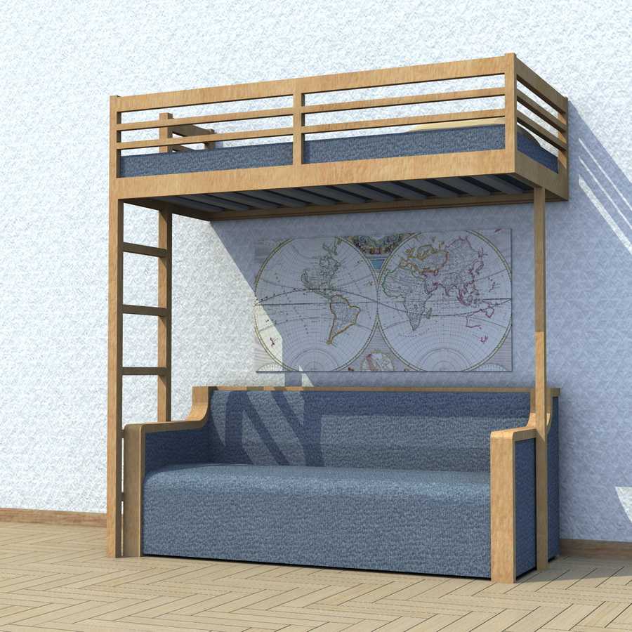 - с полной организацией рабочего места под кроватью (при этом предусматривается наличие полок, места под компьютер, а сама кровать расположена на высоте выше 160 см над уровнем пола).