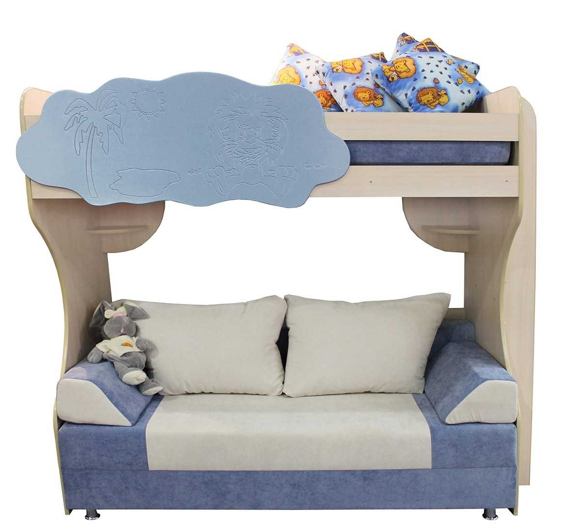 Кровать-чердак с диваном внизу позволяет организовать место для отдыха или встреч с друзьями. Подойдет, если в комнате живут двое детей, диван можно раскладывать и использовать в качестве постоянного спального места. Недостатком является только то, что такая конструкция не освобождает место в комнате.