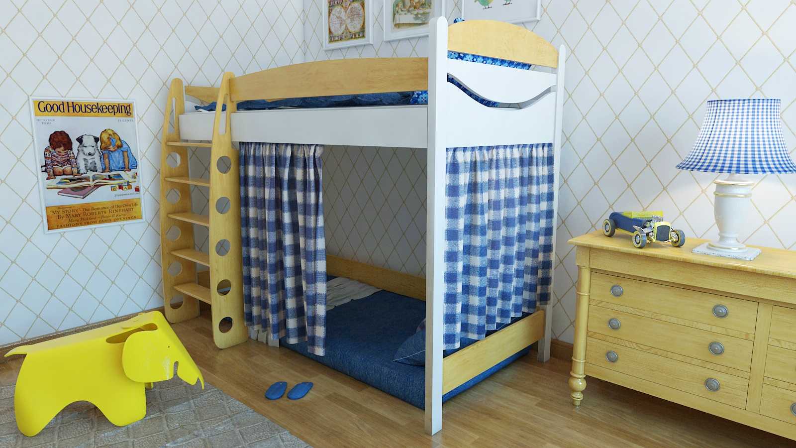 Обязательными элементами такой мебели являются каркас, спальное место и лестница, которая может быть стационарной или мобильной, вертикальной или наклонной. Остальные комплектующие нужно выбирать в зависимости от возраста и интересов ребенка, а также от размеров комнаты. Нижнее пространство может быть полностью закрыто шкафчиками и ящиками. Если нижний этаж свободен, там можно расположить стол, полки, диван или колыбель для новорожденных. В моделях для девочек этот ярус чаще всего оформляется шторками.