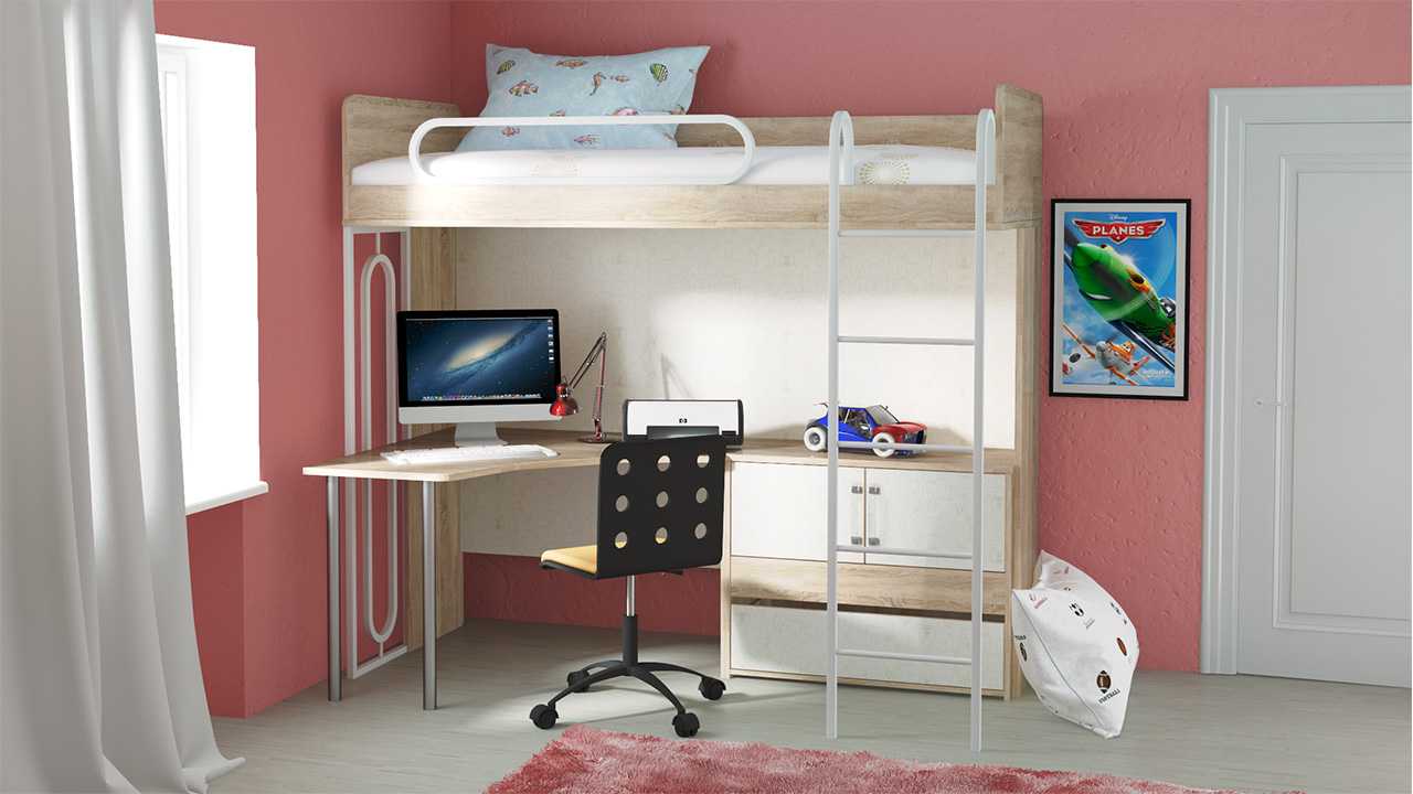 Двухъярусный комплекс обходится дешевле, чем наборная мебель (шкаф, книжный стеллаж, спальное место). Рядная установка не нарушает геометрию помещения. Единственный недостаток — громоздкость, образующаяся в небольшом пространстве.