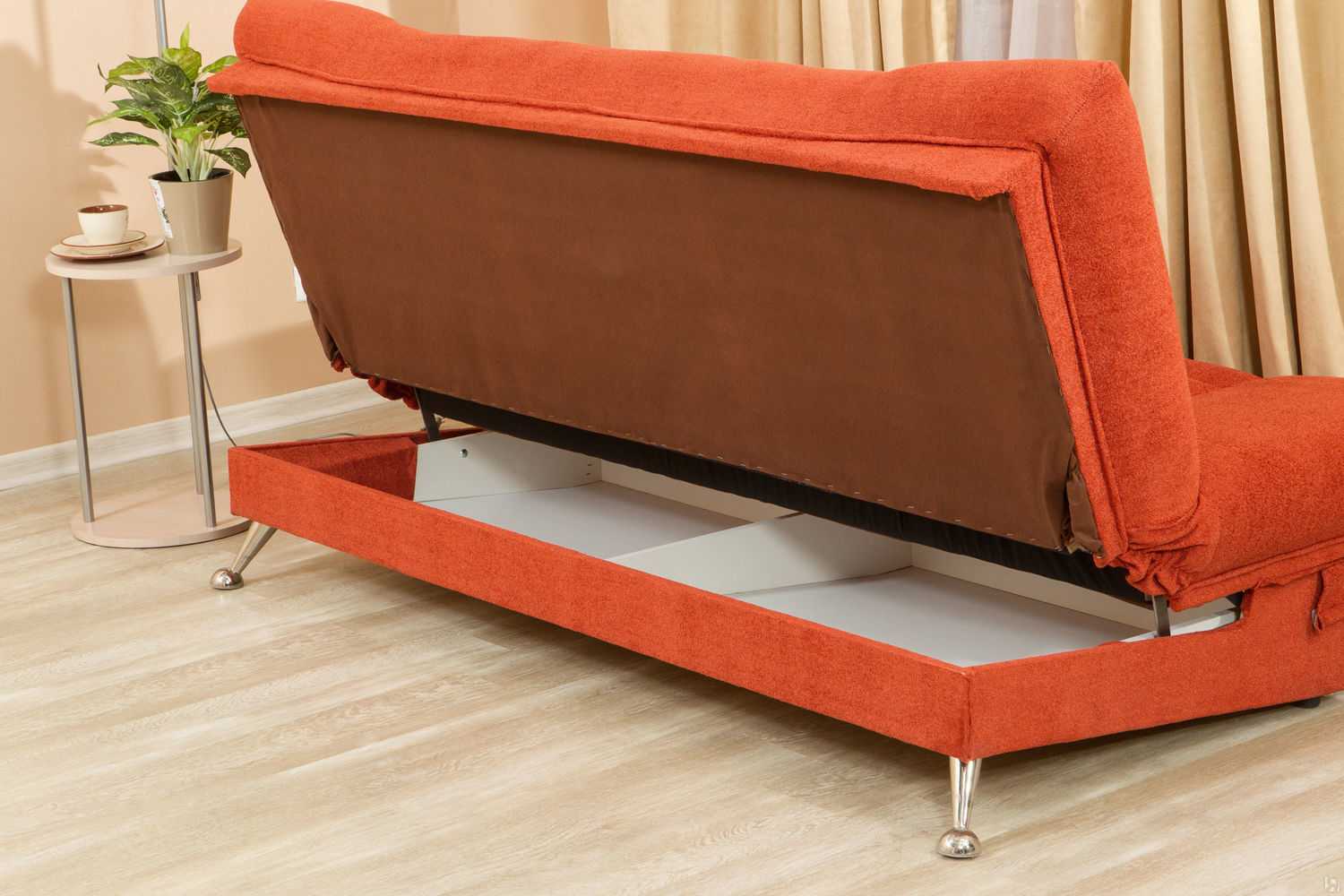 - Выкатной – сиденье перемещается вперед, его место занимает спинка дивана. Гарантированное время службы – не менее 10 лет. Недостатками являются небольшая высота спального места над уровнем пола, маленький отсек для белья или его полное отсутствие.