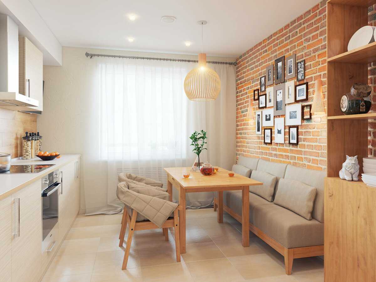 Дизайн кухни с диваном 9 кв м в современном стиле и природной цветовой гамме