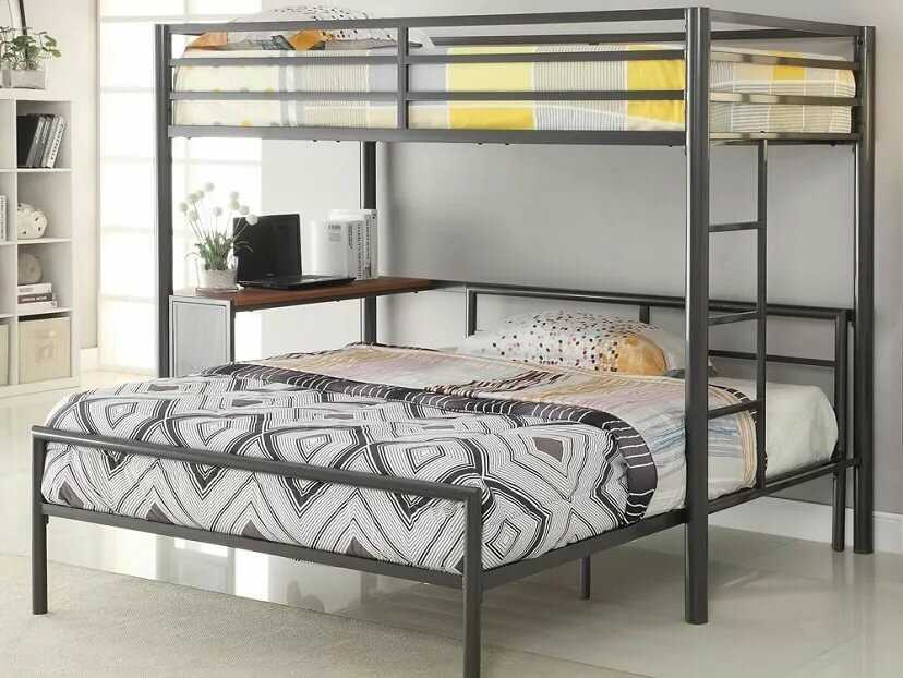 - Практичность. Часто вместо нижнего яруса модель дополнена рабочим столом, комодом или небольшим диванчиком, благодаря чему конструкция выполняет функцию сразу двух изделий.