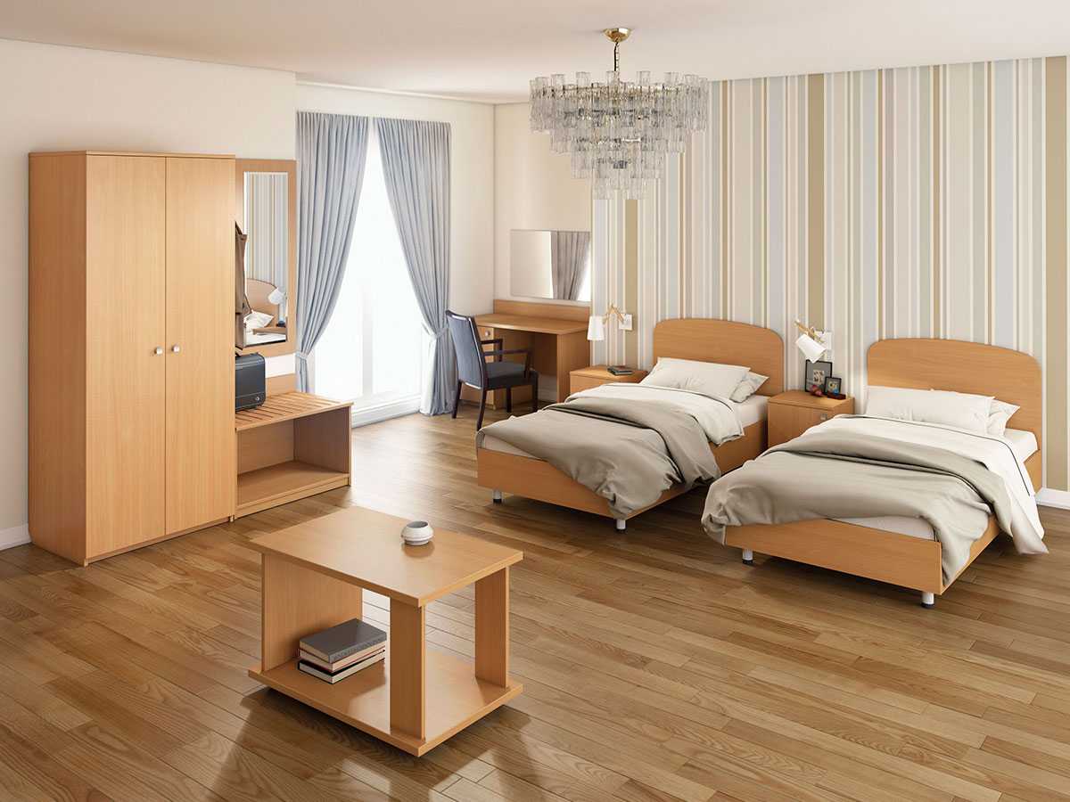 В зависимости от категории отеля, требования к материалам могут отличаться. Мебель для отелей и гостиниц экономкласса производится из кашированного и ламинированного ДСП. Для заведений высшего класса применяются плиты ДСП, шпонированные натуральной древесиной. Корпусная мебель для номеров бизнес-класса производится из МДФ. Данный материал значительно прочнее и долговечнее. Кроме того, МДФ не содержит токсичных добавок, обработка поверхностей происходит специальными экологичными лаками.