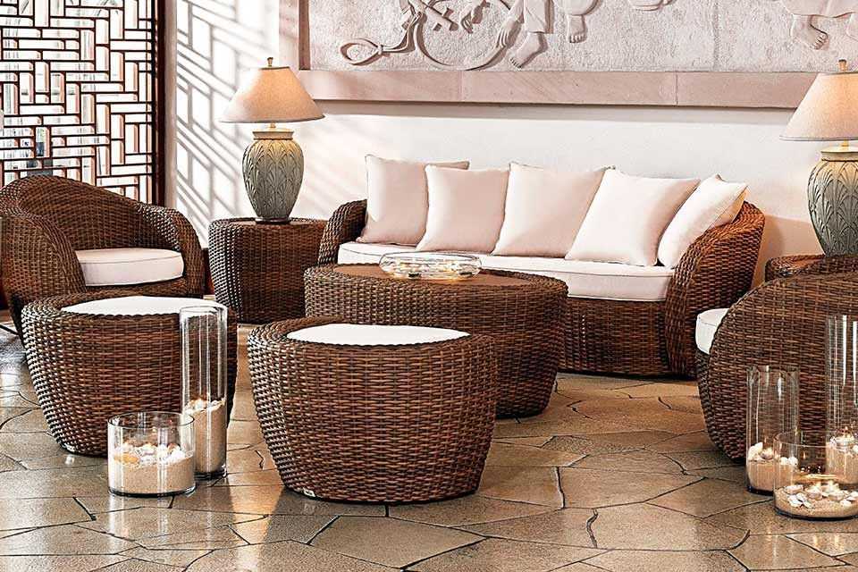 Столы и плетеные кресла часто изготавливают из искусственного ротанга. Такая мебель может находиться на открытой площадке в любую погоду. Плетеный декор отлично сочетается с такими материалами, как стекло, полированное дерево. Для большей прочности каркас выполняют из металла.