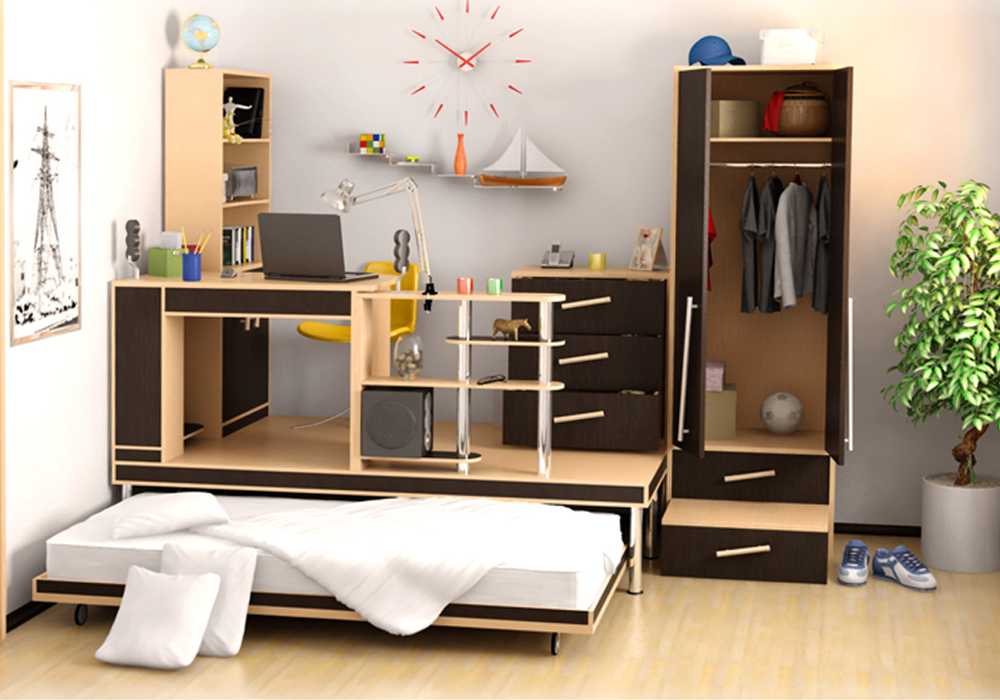 - Каких бы размеров ни была комната подростка, компактность — важная характеристика для кровати. Встречи с друзьями, спорт — все это требует свободного пространства. Чтобы сэкономить место, мебель для сна объединяют с рабочей зоной для подростка;