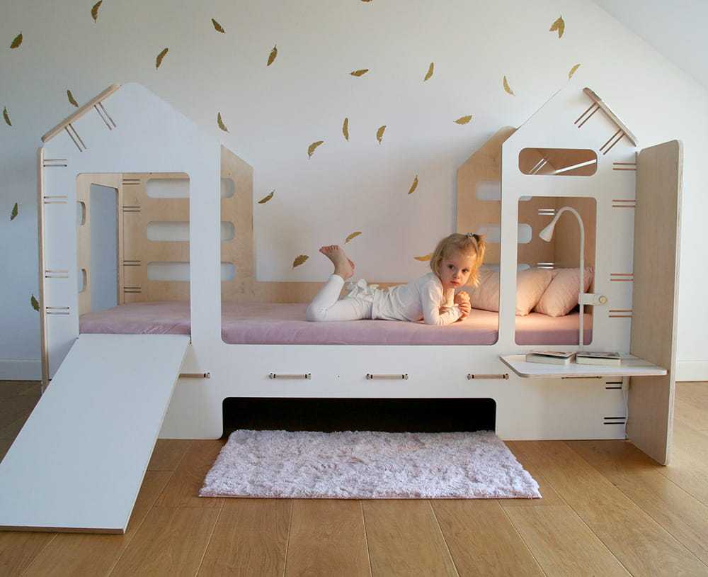 Такая мебель отличается от взрослой не только размерами, но и оформлением. В предназначенных дошкольникам моделях отсутствуют острые углы, цвета подбираются яркие, возможна кровать-машина, кровать-карета или даже целый корабль