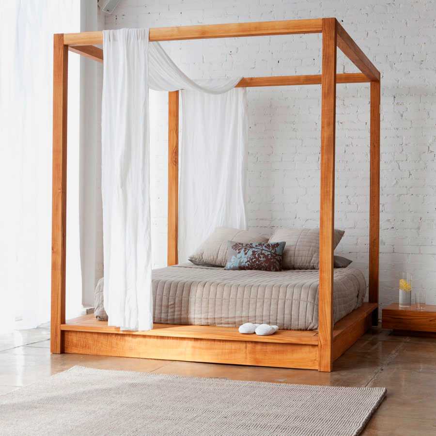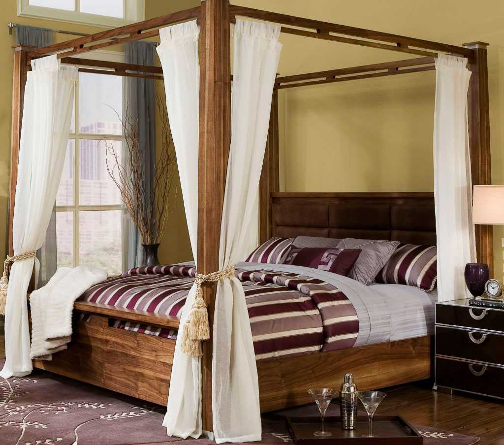 Если в семье есть умелец, то можно сделать деревянный или металлический каркас для балдахина по размеру кровати. Нужно лишь продлить высоту ее ножек до нужно уровня, соединив сверху прямоугольной рамой из балок или металлических стержней. С подобной конструкцией лучше всего смотрится двуспальная кровать. В деревянные балки можно установить направляющие с крючками, за которые будет подвешиваться текстиль, а металлические стержни снабдить обычными гардинными кольцами.