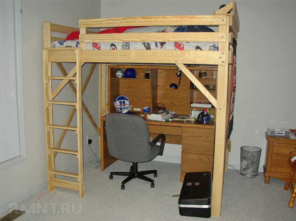 Несколько большей визуальной лёгкостью обладает каркас из цельной древесины. Такую схему очень просто представить — это обычная кровать, но на очень высоких ножках, связанных между собой перекладинами в самом низу, то есть двухъярусная кровать без нижнего ложа. Достоинством деревянного каркаса можно назвать хорошую «просвечиваемость» — для обустройства нижней рабочей зоны необязательно организовывать местное освещение. Из недостатков особо выражены значительный вес и трудности в разборке кровати, а также необходимость тщательной обработки материалов — шлифовки, пропитки, покраски.