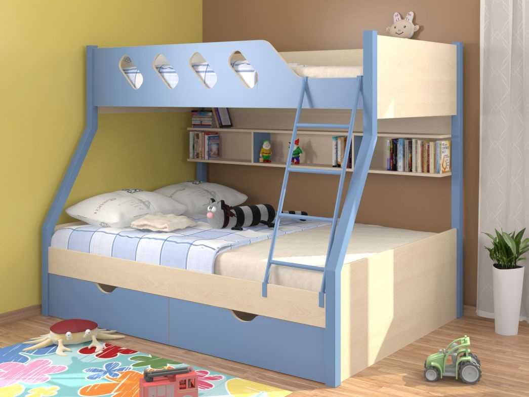 Лестница в такой модели состоит из ящиков либо полок, что, с одной стороны, несколько увеличивает размеры конструкции, а с другой – позволяет отказаться от размещения шкафа. Также под нижней кроватью может располагаться бельевой пенал.
