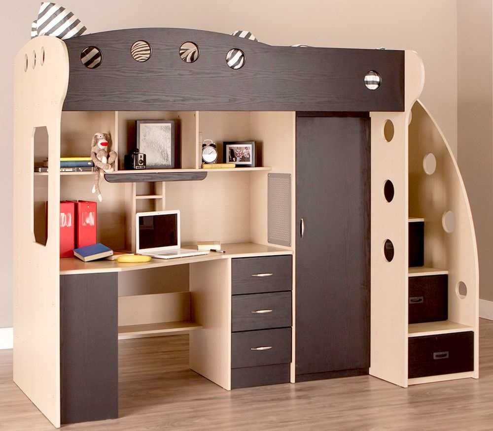 Достаточно популярная модель для одного ребенка при дефиците пространства. Состоит из шкафов и ящиков, стола и спального места, причем раскладываться или выдвигаться может как матрас, так и стол.