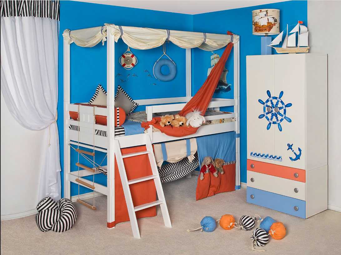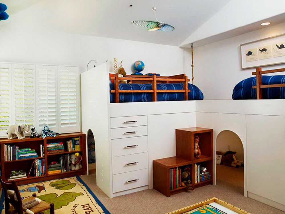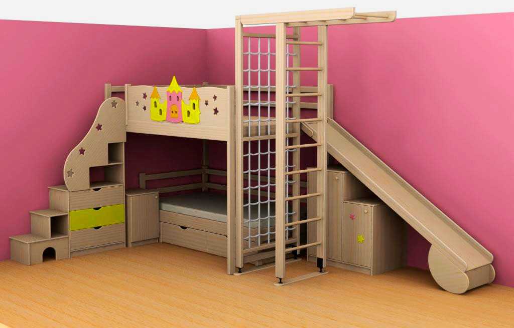 Все больше родителей при обустройстве детской комнаты стараются выбрать кровать-чердак. Сверху рассматриваемой конструкции установлено спальное место, а внизу находится пространство для работы, игры или хранения вещей. Рабочая зона обычно представлена письменным столом в комплекте с открытыми полками и выдвижными ящиками. Для активного ребенка можно выбрать двухъярусное спальное место со спортивной площадкой (канатом, баскетбольной сеткой, шведской стенкой или турниками). В качестве места хранения под верхним ярусом кровати может быть установлен комод, шкаф, полки и т. д.