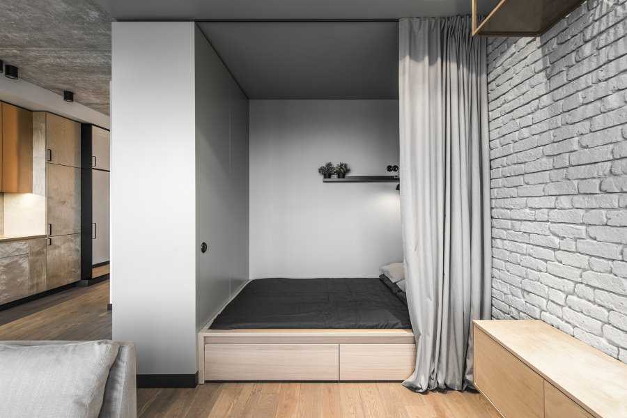 И это главный аргумент тех, кто боится ставить кровать в однушке или студии. Конечно, вряд ли в совсем маленькой квартире площадью 17-20 квадратов есть место кровати — это абсолютно нерациональная трата метров, но и в полноценной однушке от 30 м2 все равно многие хотят обустроить полноценную гостиную зону.