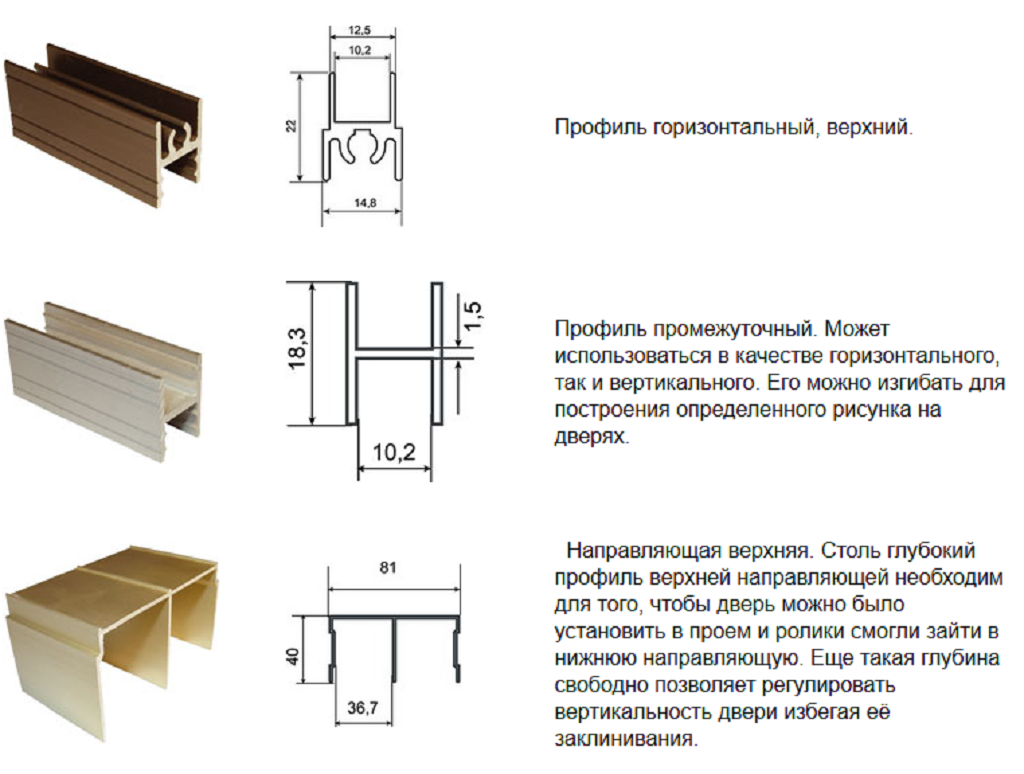 Направляющие бывают верхние и нижние, разных конфигураций и размеров — под них, соответственно, подбираются и роликовые механизмы.