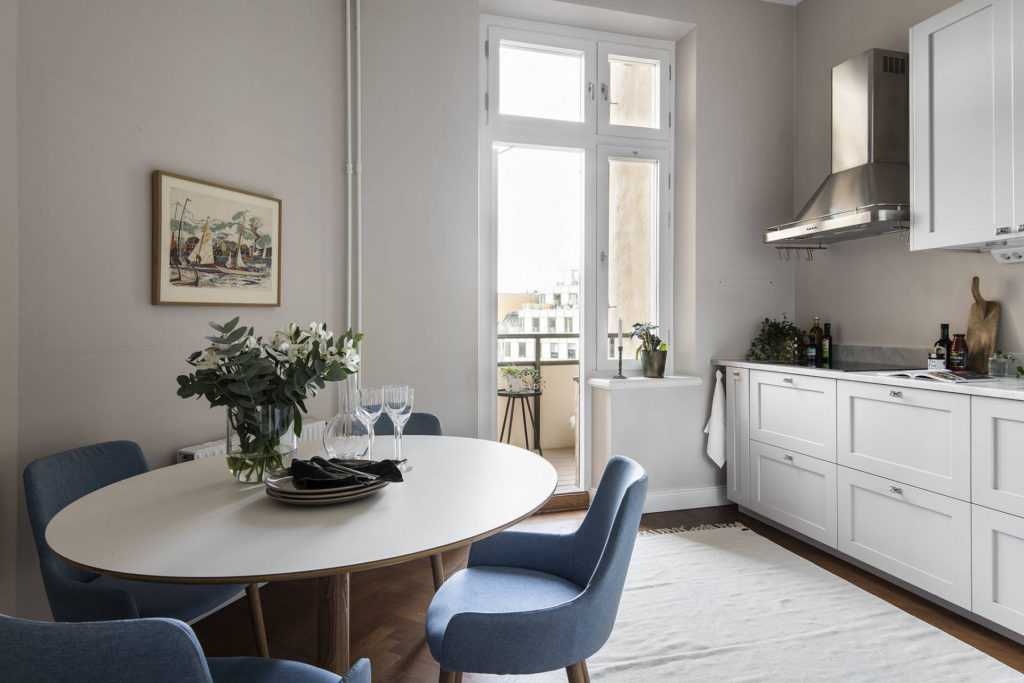 Если семья состоит не более, чем из двух человек, то для обеденной зоны можно выделить место на кухне. Например, переделанный в столешницу подоконник. К нему необходимо купить барные стулья, а лучше – барные табуреты, которые полностью задвигаются под столешницу, освобождая больше места.