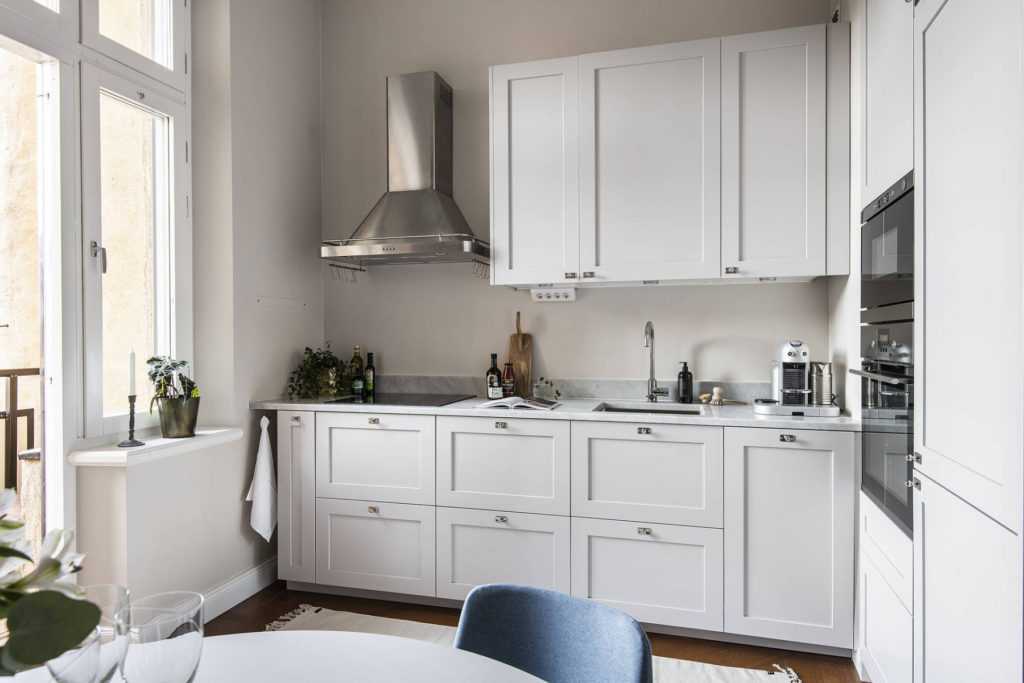 Распашная дверь в открытом состоянии загромождает пространство, поэтому в маленькой кухне чаще всего от нее отказываются, оставляя открытый дверной проем. Правда, обратной стороной такого решение может быть проникновение запахов в соседние жилые комнаты, что всегда неприятно. Чтобы минимизировать этот недостаток, установите качественную вытяжку и регулярно ее обслуживайте.