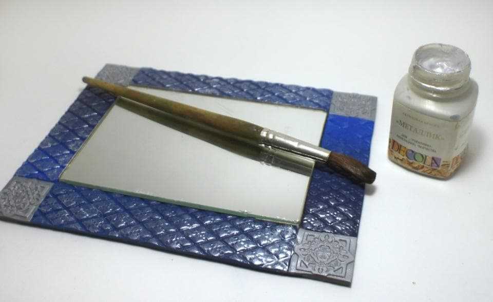 Подготовить 4 заготовки по размерам зеркала, обрезать края под углом в 45 градусовСклеить элементы между собойРамка в склеенном видеПрошпатлевать углы с изнаночной стороныЛицевую сторону покрыть грунтовкойПокрасить рамку в черный цветПосле высыхания покрыть серебристым цветом, наносить краску лучше губкойСледующим будет слой акрилаИз плотного картона вырезать заднюю стенку, проделать в ней дырочку для крючкаПромазать заготовку клеемПрикрепить зеркалоПо внутреннему бордюру рамки приклеить декоративный шнурокПокрыть краской боковиныГотовое изделие