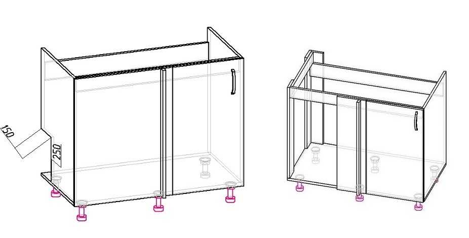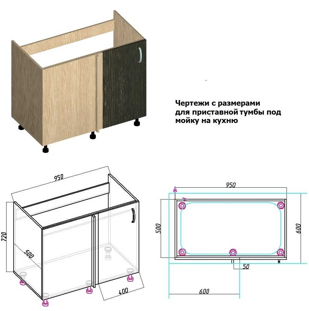 Чертежи угловых моек для кухни приставного типа могут изменяться, в зависимости от подвода коммуникаций. Если труба слива и подачи воды «заходят» слишком глубоко на внутреннюю боковину стола-мойки, то ее делают составной из планок.