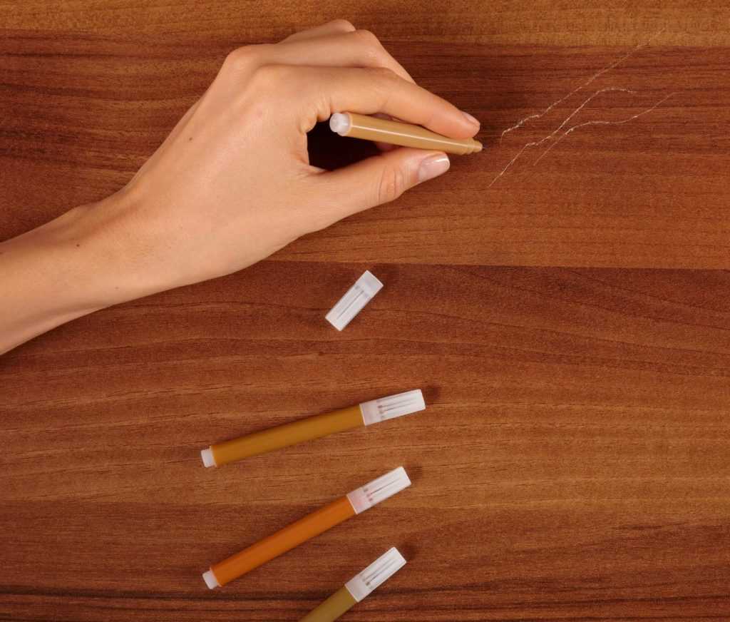 - При нанесении карандаша на мебель придется его расплавить,но не с помощью открытого пламени. Всему виной пчелиный воск, входящий в состав, карандаш просто загорится. Для плавления используют нагретый металлический предмет. Отлично подойдет для этого нож. Его нагревают над пламенем и плавят карандаш, после чего продолжают ремонт шпона на мебели;