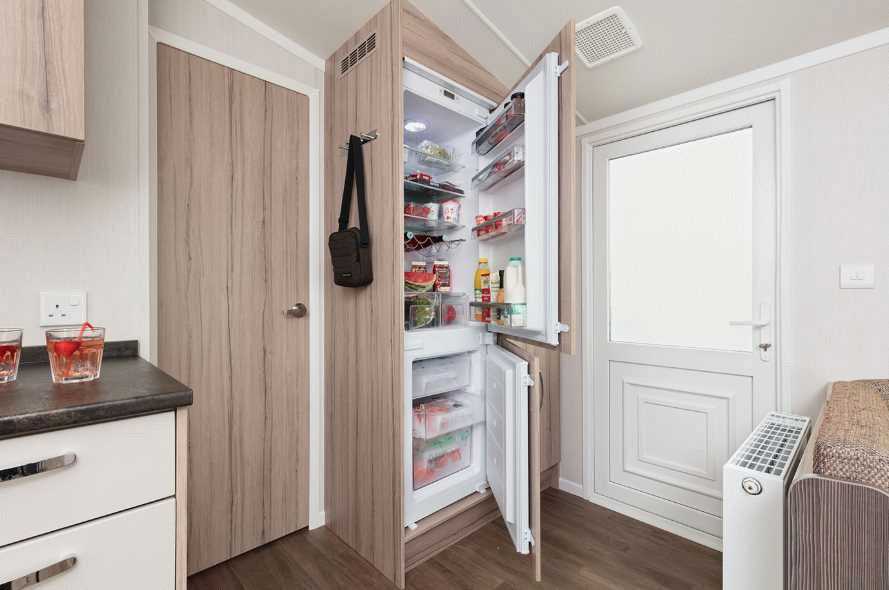 - Глубина камеры: обычный холодильник на полную глубину в среднем составляет 76-90 см, что на порядок больше, чем у встроенных моделей с теми же габаритами.