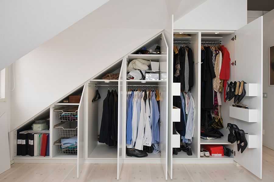 Встроенный шкаф под лестничным маршем имеет следующие преимущества и недостатки:
