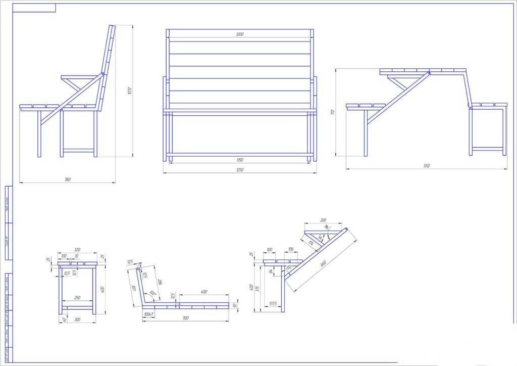 Предлагаем вам типовой чертёж — схему скамейки — трансформера с указанными на нём размерами. Самым сложным действием является создание подвижного механизма, поэтому изначально необходимо подготовить все заготовки, которые потом будут собираться между собой в единую трансформационную конструкцию.