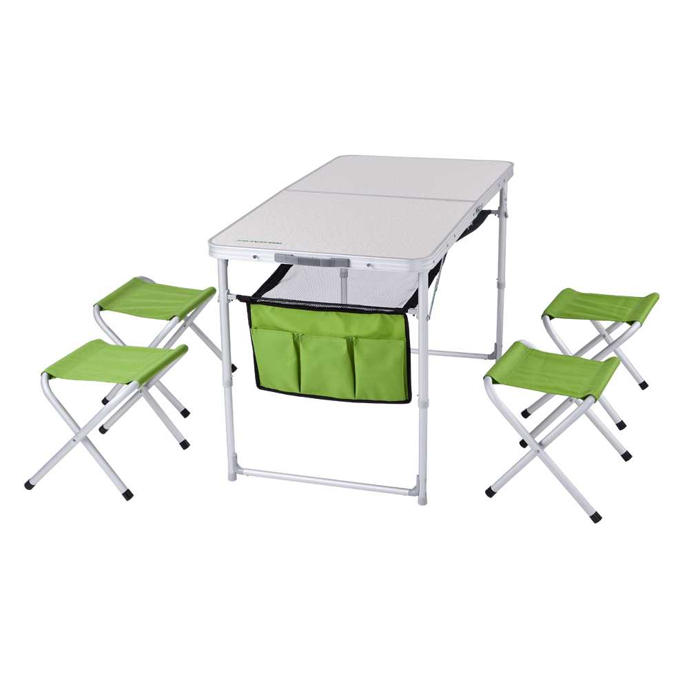 - Комплект из стола и стульев Event Set 95 ─ он считается семейным набором, который состоит из стола и 4 стульев. Особенностью этого набора является то, что стол можно установить на неровную поверхность. Пластиковые шайбы, установленные на ножках, позволяют выровнять горизонт столешницы. Набор компактно складывается в плоский кейс, общим весом 7,3 кг. Стол с огнеупорной пластиковой столешницей имеет размер 95х61х60 см, а алюминиевый стул 41х29х34 см. Стол выдерживает нагрузку до 30 кг, а стул до 100 кг;