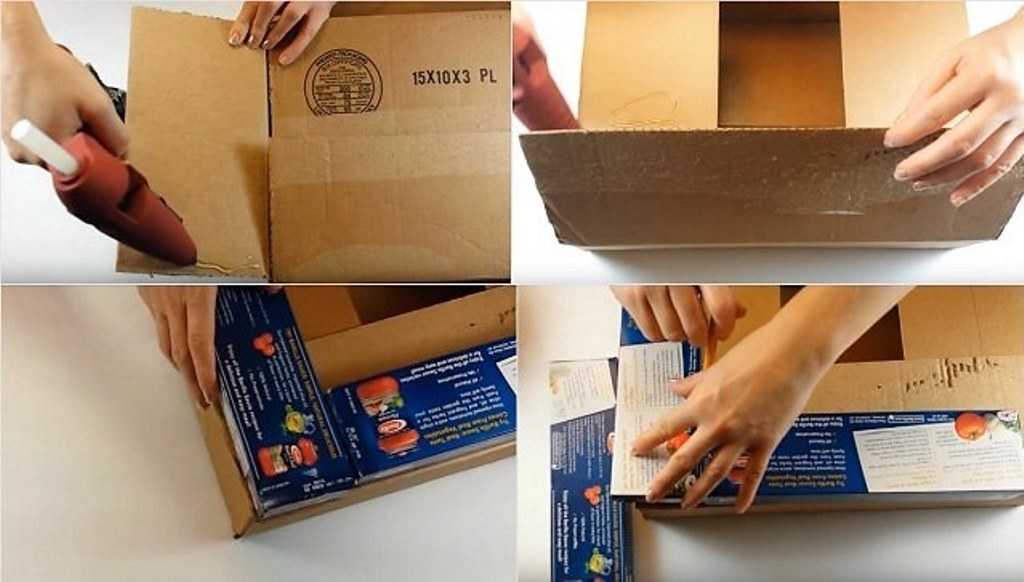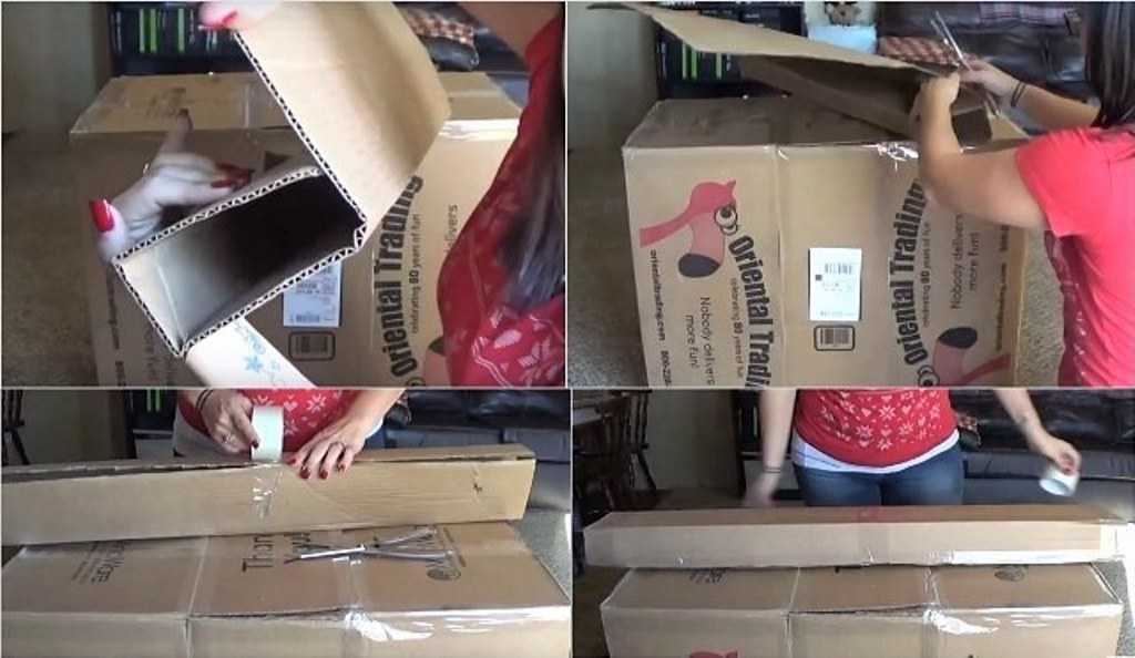 Картон для создания предмета подойдет любой, но предпочтителен гофрированный – например, ящик от телевизора, холодильника, стиральной машины и др. Иногда используется три-четыре маленьких коробочки, которые склеиваются между собой либо скрепляются степлером.