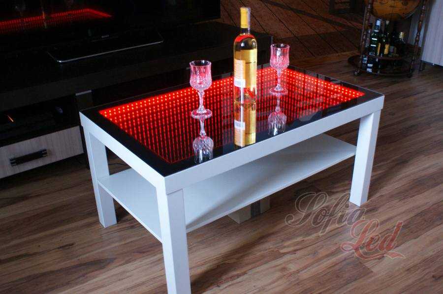 Если смотреть на стол с подсветкой, то можно представить, что в глубине существует портал в иное измерение. Для достижения подобного эффекта понадобятся всего 2 зеркала нужного размера и светодиоды, которые будут располагаться между ними. Цвет ламп при этом может быть любым. Включение стола со светодиодной подсветкой осуществляется при помощи пульта или небольшой кнопки. Лампы экономичны, долговечны и безопасны для человека и окружающей среды. Кроме того, можно делать подсветку из светодиодной ленты.