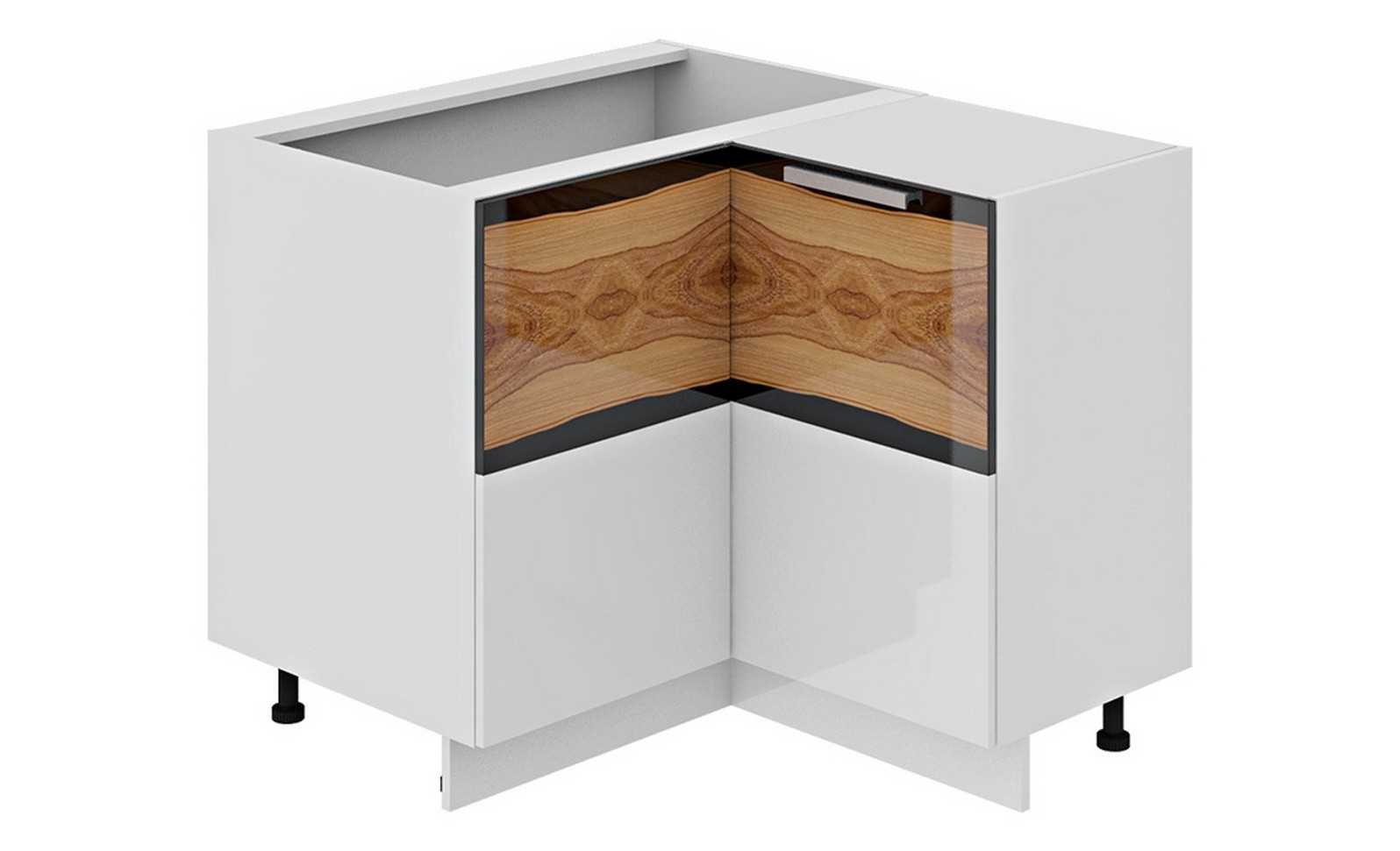 - Торцевые. Заканчивают обычно ряд кухни скругленным или скошенным модулем. Он имеет характерную треугольную конструкцию, оснащается прямой или радиусной дверцей. Или остается открытым, со скругленными или спиленными полками.