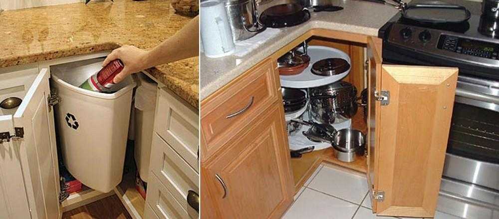 Из-за довольно объемных размеров угловой кухонный шкаф данного вида редко используется в малогабаритных кухнях, поскольку «съедает» много места. Да и внутреннее пространство используется крайне нерационально: без дополнительных приспособлений в виде выдвижных корзин, ведер редко удается задействовать более 20% свободного места внутри. Это некритично, когда кухня довольно большая и нет нужды задействовать каждый сантиметр для хранения.