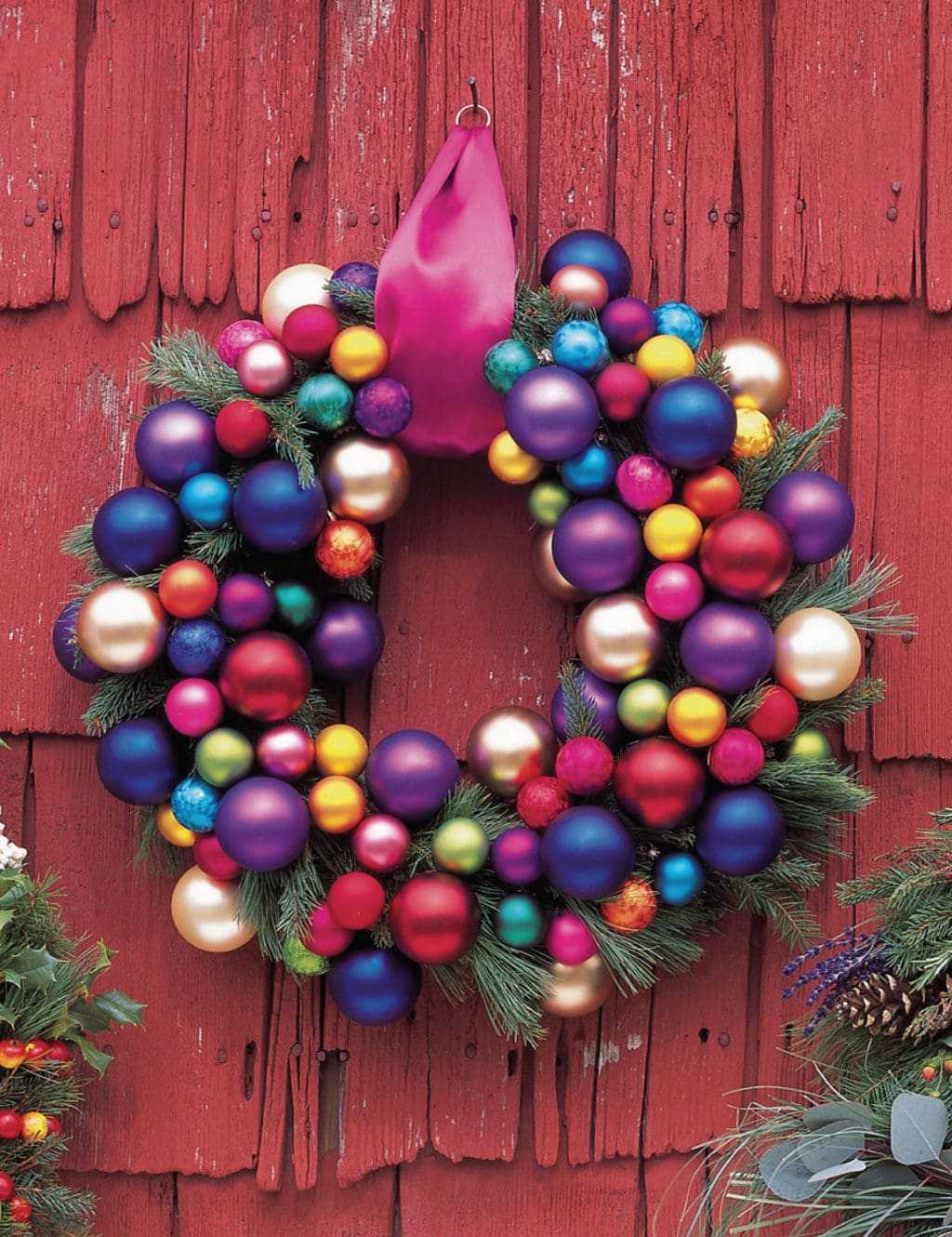 - Собрав шары на прочную леску, получают настенное украшение. Можно изготовить венок и прикрепить над дверью.