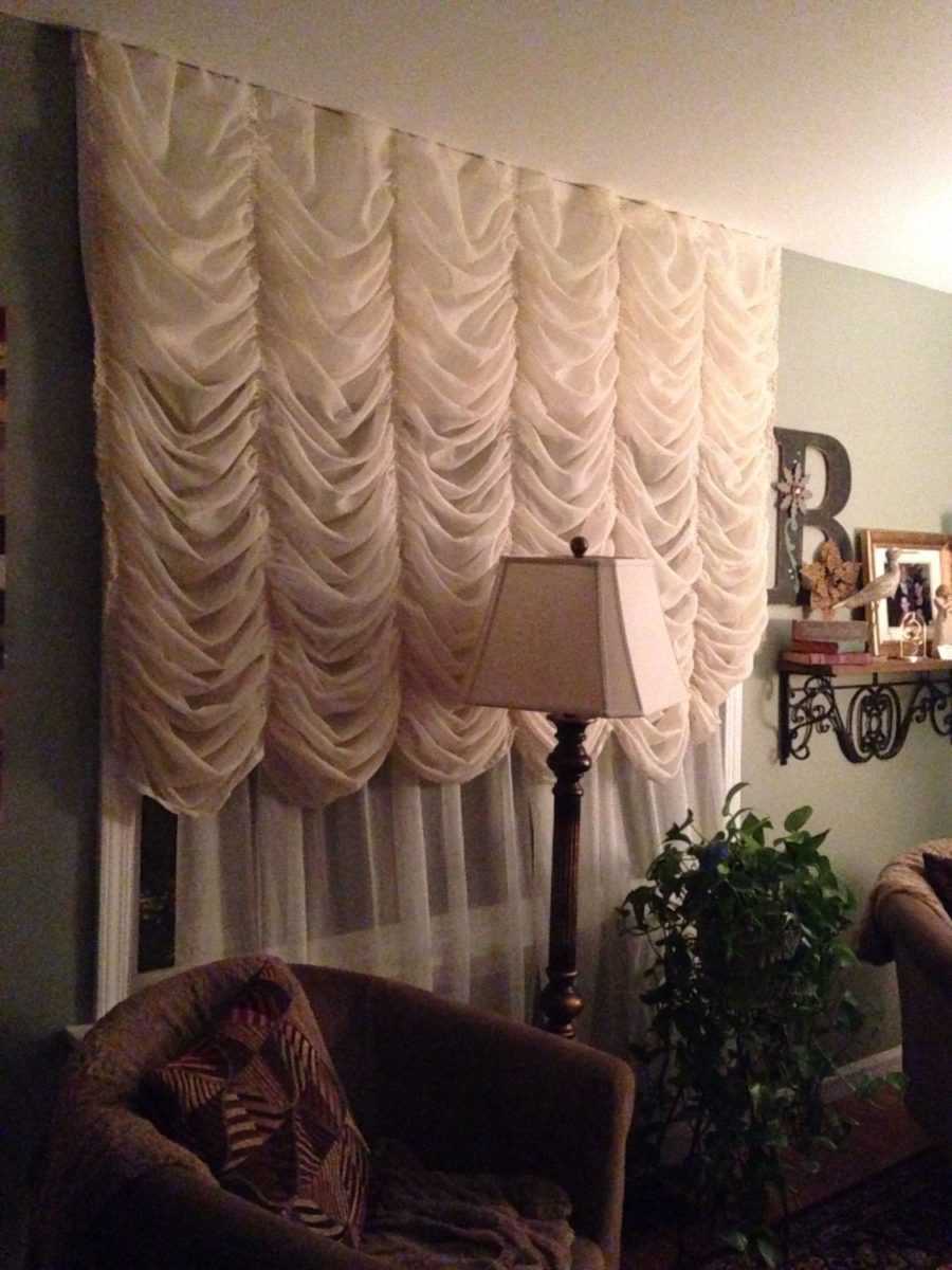 Если окно узкое, то широкий отрез ткани просто делят пополам. При определении требуемого количества колец рекомендуется сначала прикрепить английские булавки и протянуть через них шнур. После этого оценивают драпировку полотна. Если результат устраивает, то вместо булавок пришивают кольца. После этого шнур крепят на выбранной высоте и протягивают через кольца по направлению снизу вверх, а затем фиксируют на крючке-держателе.