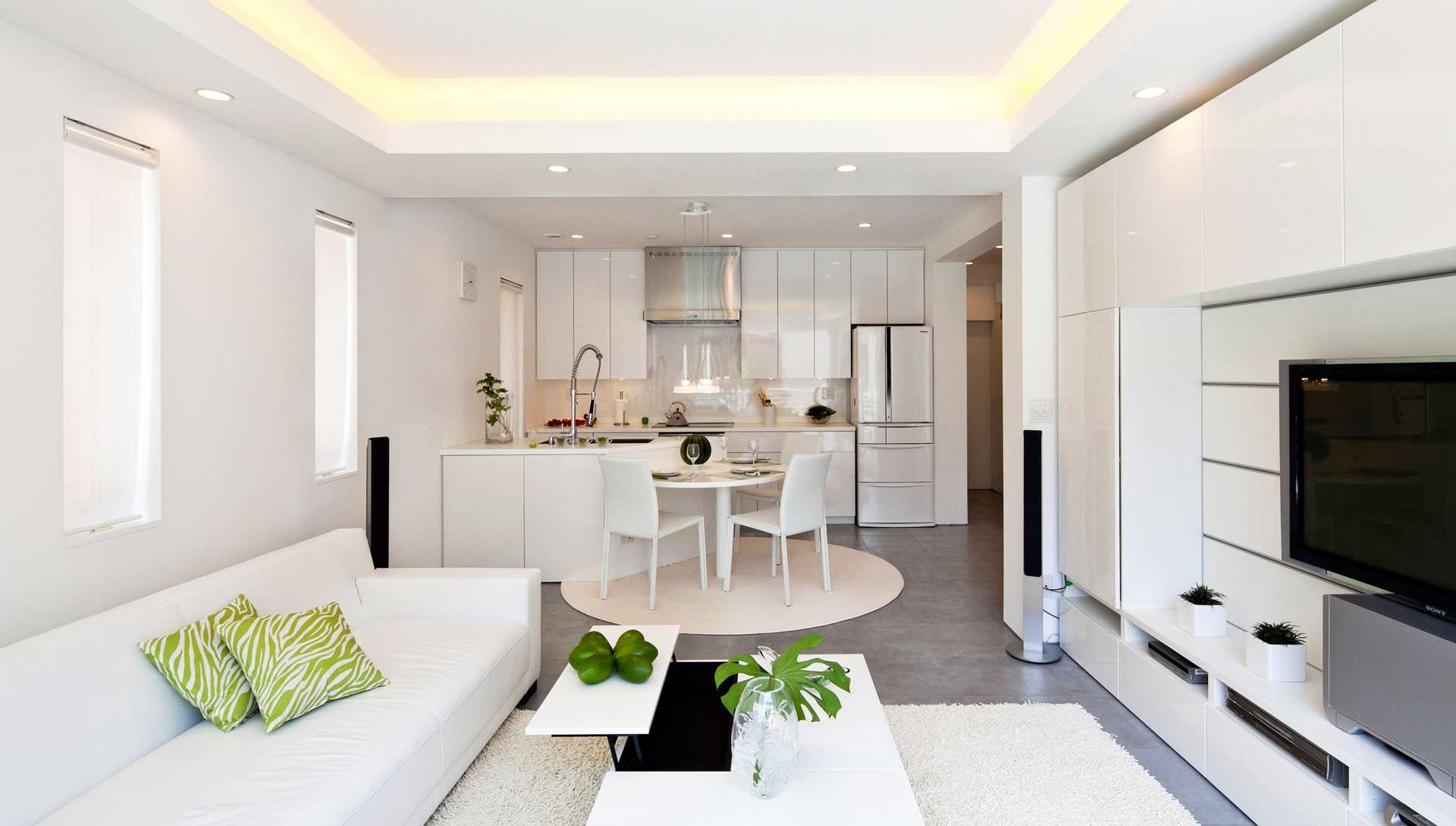 С отдельностоящим столом для компьютера следует быть осторожным, чтобы он не стал центром внимания, ведь там постоянно скапливаются редко убираемые, «очень важные» вещи. Среди материалов для диванов лучше выбирать кожу или же синтетическую ткань, которая не только идеально впишется в минимализм, но и прослужит достаточно долго.