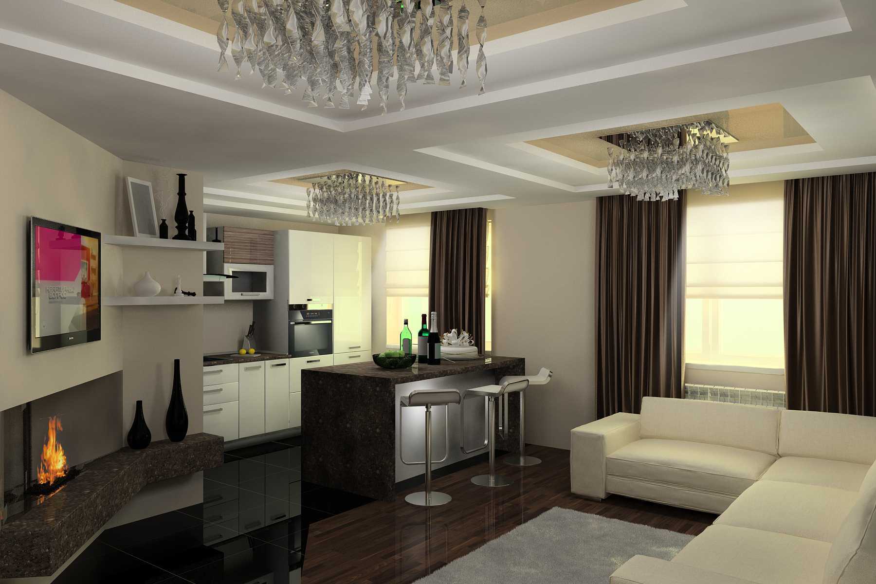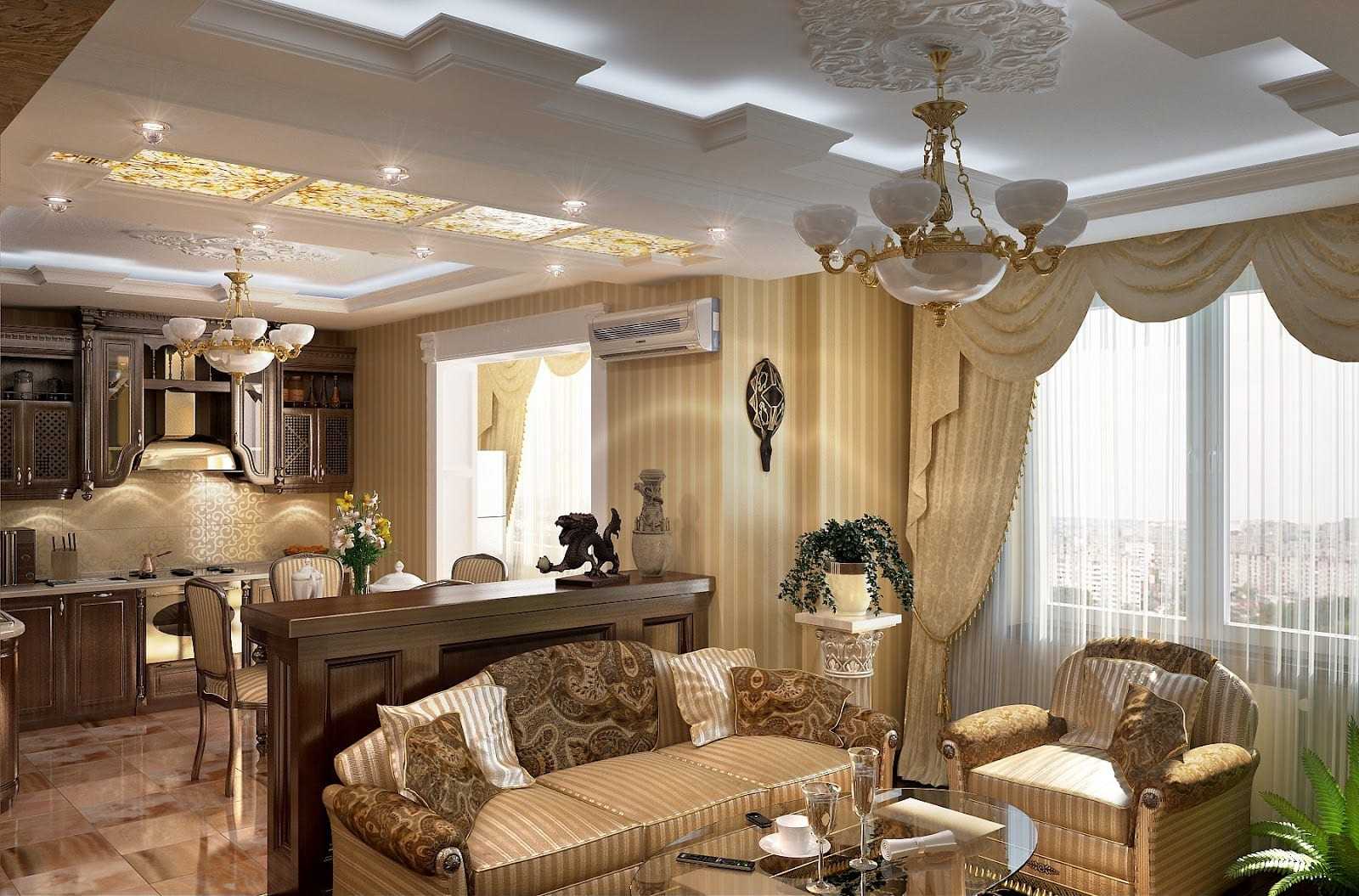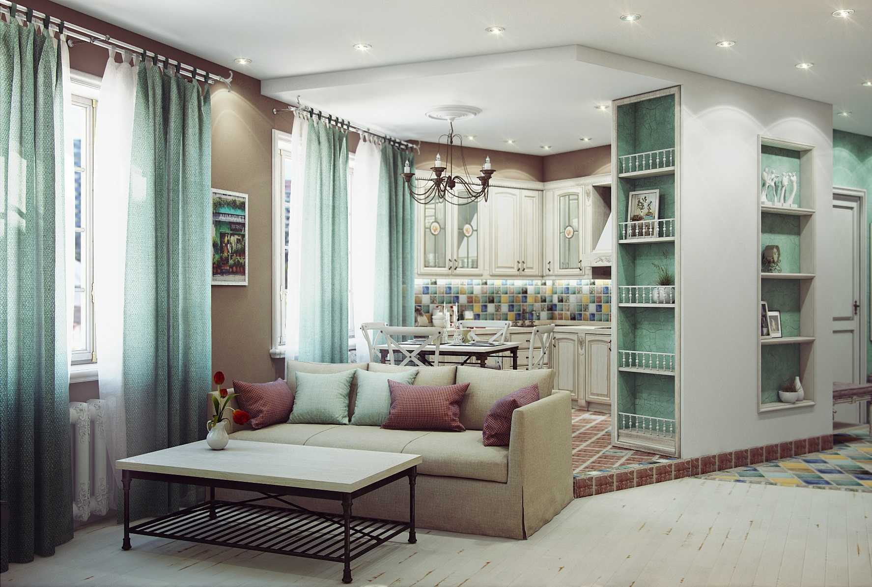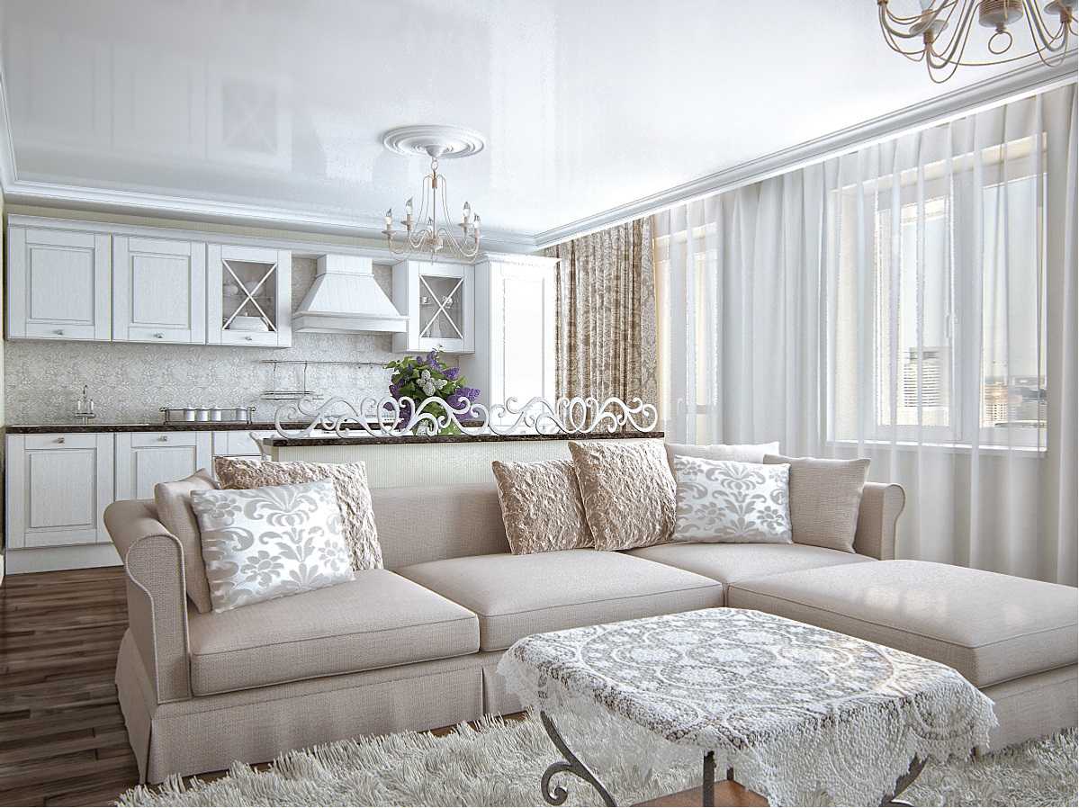 Хорошо смотрятся помещения, в которых гостиная украшена длинными портьерами с тюлем до пола, закрепленными на подхватах или стеновых крючках, а зона кухни имеет жалюзи или римскую штору, сшитые из этих же материалов. В обеденной части комнаты также стильно будет смотреться очень короткий ламбрекен на карнизе, который можно совместить с занавесками из этой же ткани.
