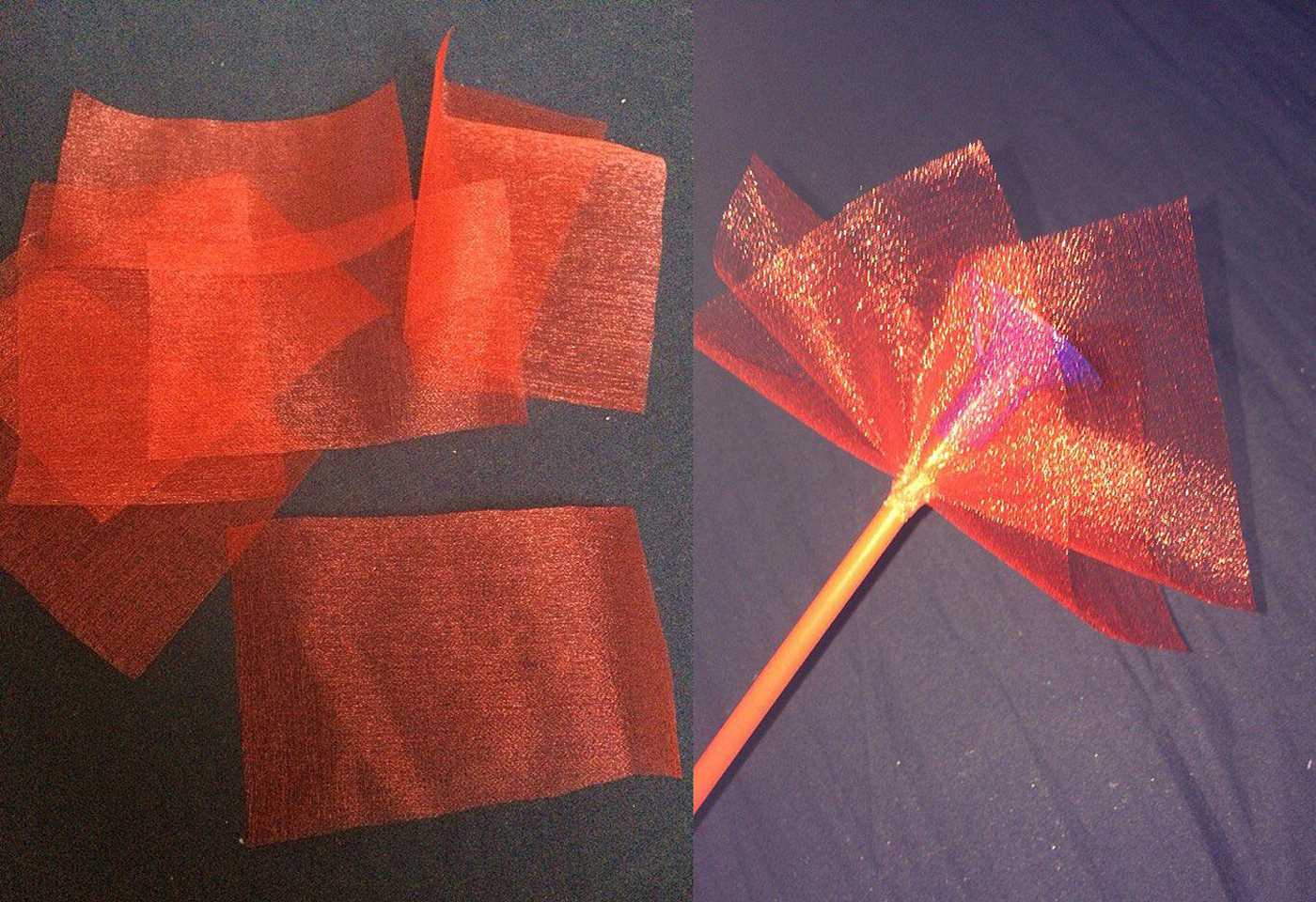 То же самое проделайте из специальной сетки для букетов и закрепите поверх органзы. Должны получиться своеобразные цветочки, как показано на фото.