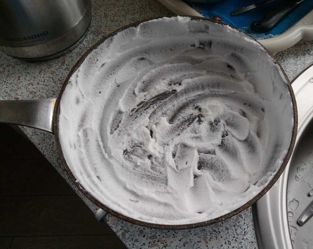 Ёмкость с водой ставится на печку. Пока жидкость нагревается, в неё добавляются все ингредиенты. Когда мыло растворится и вода закипит, в смесь опускается сковорода. Оставляем вывариваться на час-полтора, и, после того как большая часть накипи сама отделится от стенок, процесс можно завершать. Остывшая посуда доводится до полного очищения не очень жёсткой щёткой.