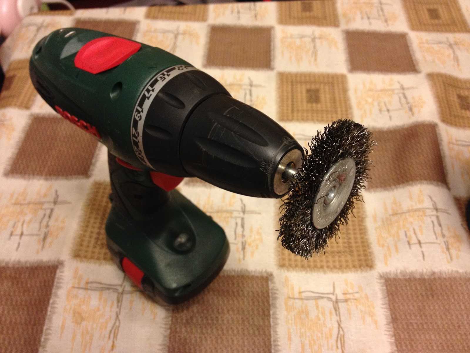 Болгаркой или дрелью пользуются, если надо очистить наружную поверхность сковороды.