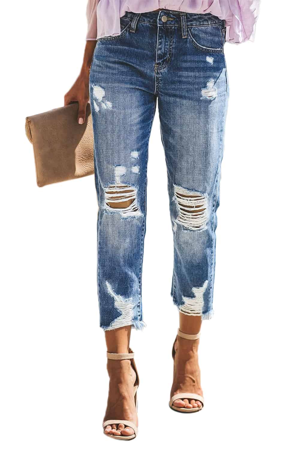 Топ, украшенный рюшами, и босоножки на высоком каблуке – идеальное дополнение к рваному дениму. Блузка или приталенный свитер пастельных оттенков тоже будут гармонично смотреться в данном образе.