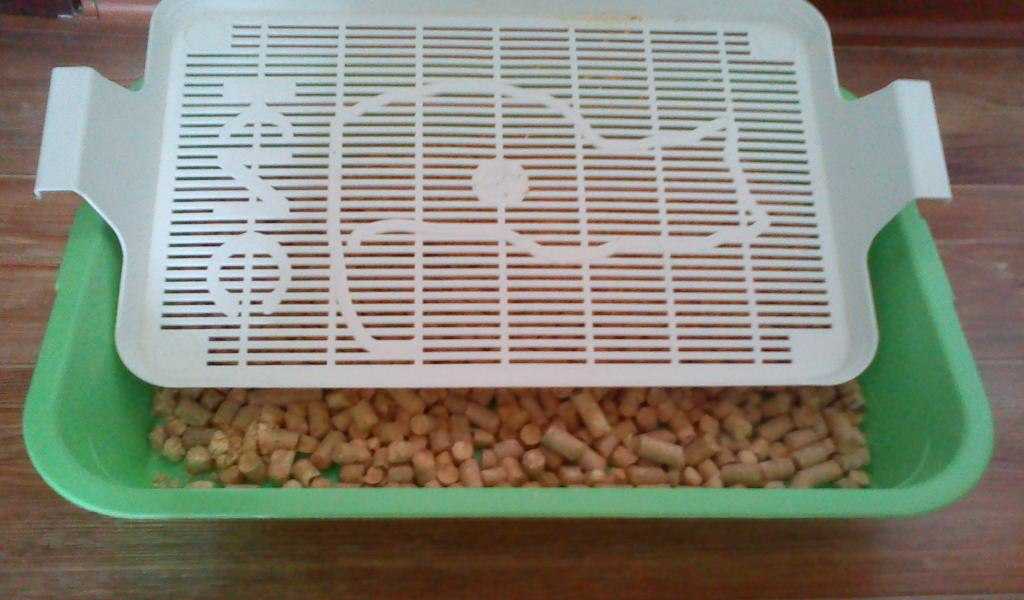 - Наполнить поддон гранулами. Количество наполнителя зависит от его вида. Если, к примеру, используется древесный материал, заполняя им лоток, надо учитывать, что при намокании он значительно увеличивается в объеме. Между поверхностью слоя гранул и решеткой должно быть определенное расстояние, чтобы влага уходила в него, а не оставалась на сетке.