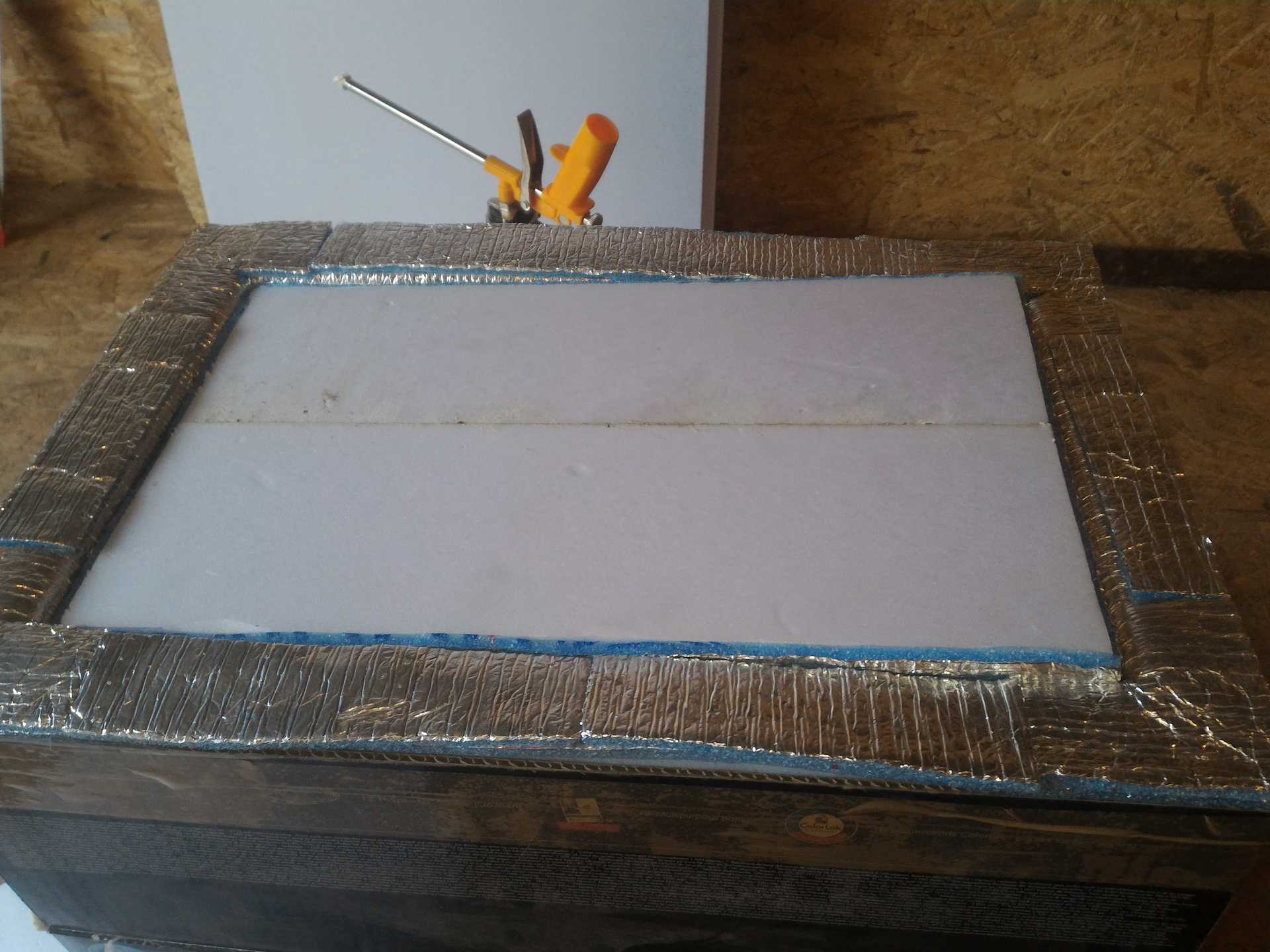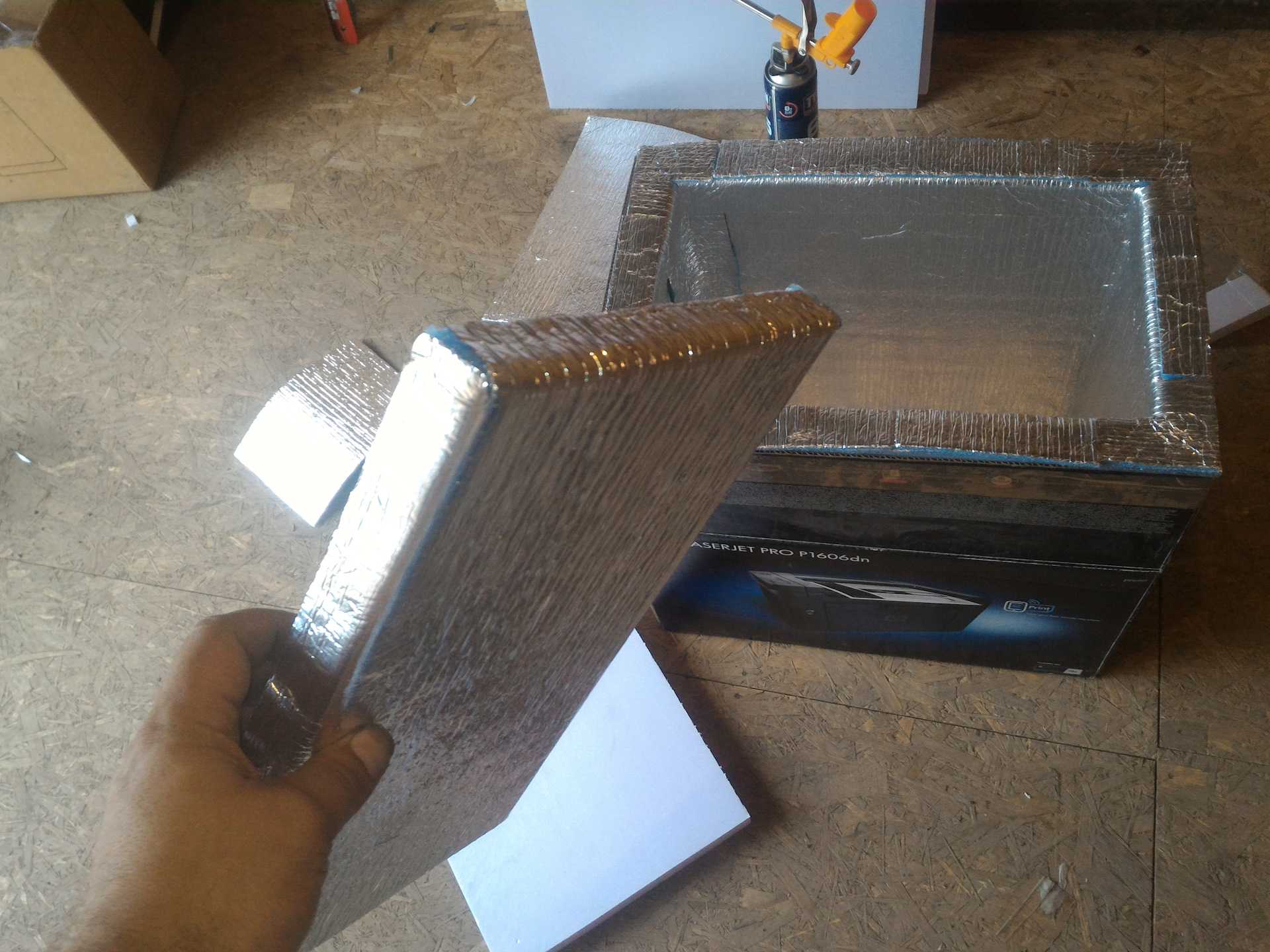 - Теперь нужно оклеить фольгой изнутри боковые стенки, дно и крышку термоконтейнера клеем ПВА или «жидкими гвоздями». На время застывания клея фольгу нужно придавить плоскими элементами. Чтобы их зафиксировать внутри коробки можно использовать книги, тряпки и прочее.
